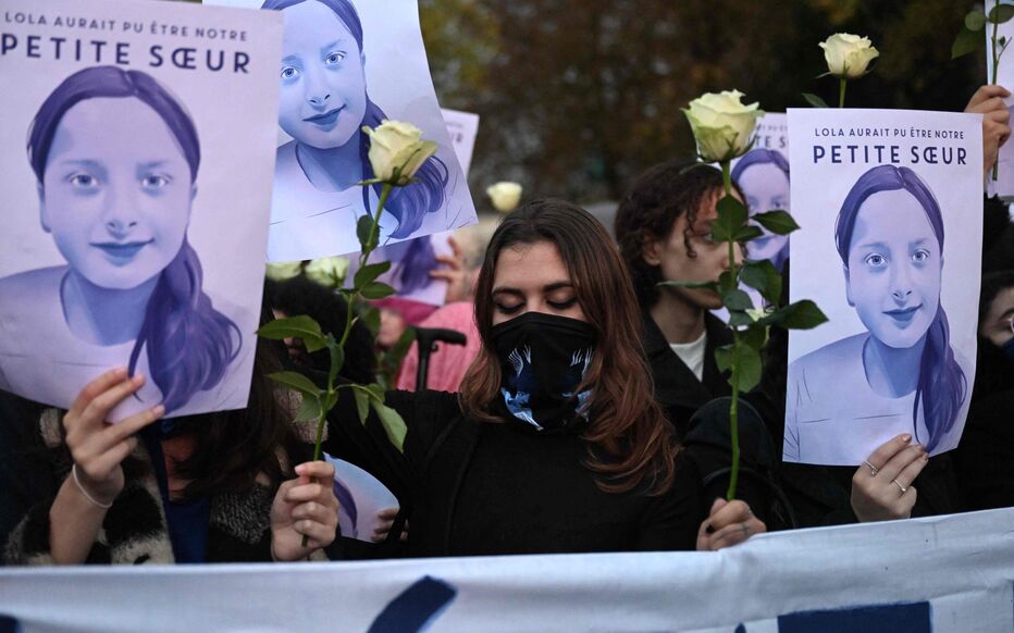 Protesters hold portraits of "Lola" reading 'Lola could have been our little sister' during a rally called by the far-right organization 'Institut pour la Justice' in Paris on october 20, 2022. - Far-right figures gather to pay tribute to murdered 12-year-old whose brutalised body was found in a trunk in a killing that shocked France. The brutalised body of the victim, identified only as "Lola" under French law, was found in a plastic box after going missing in northeast Paris last week. A 24-year-old woman from Algeria was quickly identified as the main suspect and detained. Police have determined she had a history of psychiatric disorders. (Photo by Emmanuel DUNAND / AFP)