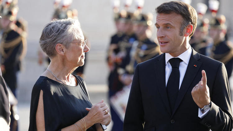France's President Emmanuel Macron (R) and France's Prime Minister Elisabeth Borne chat as they wait for the arrival of the Indian Prime Minister ahead of a dinner at The Louvre Museum in Paris, on July 14, 2023. (Photo by Ludovic MARIN / AFP)